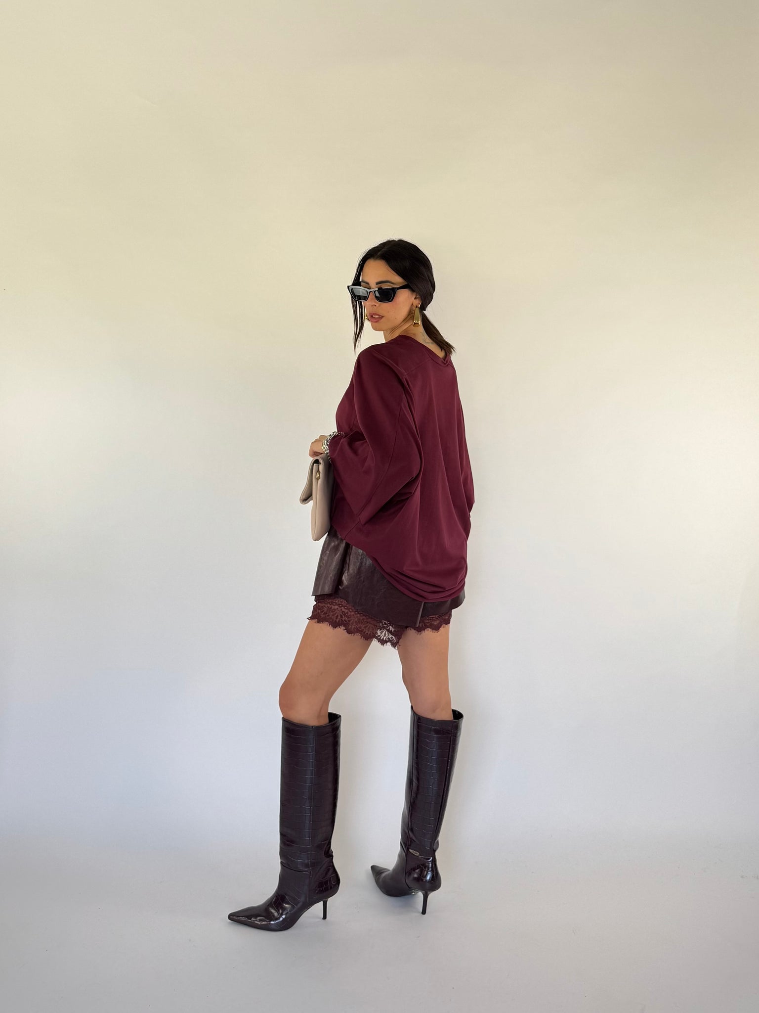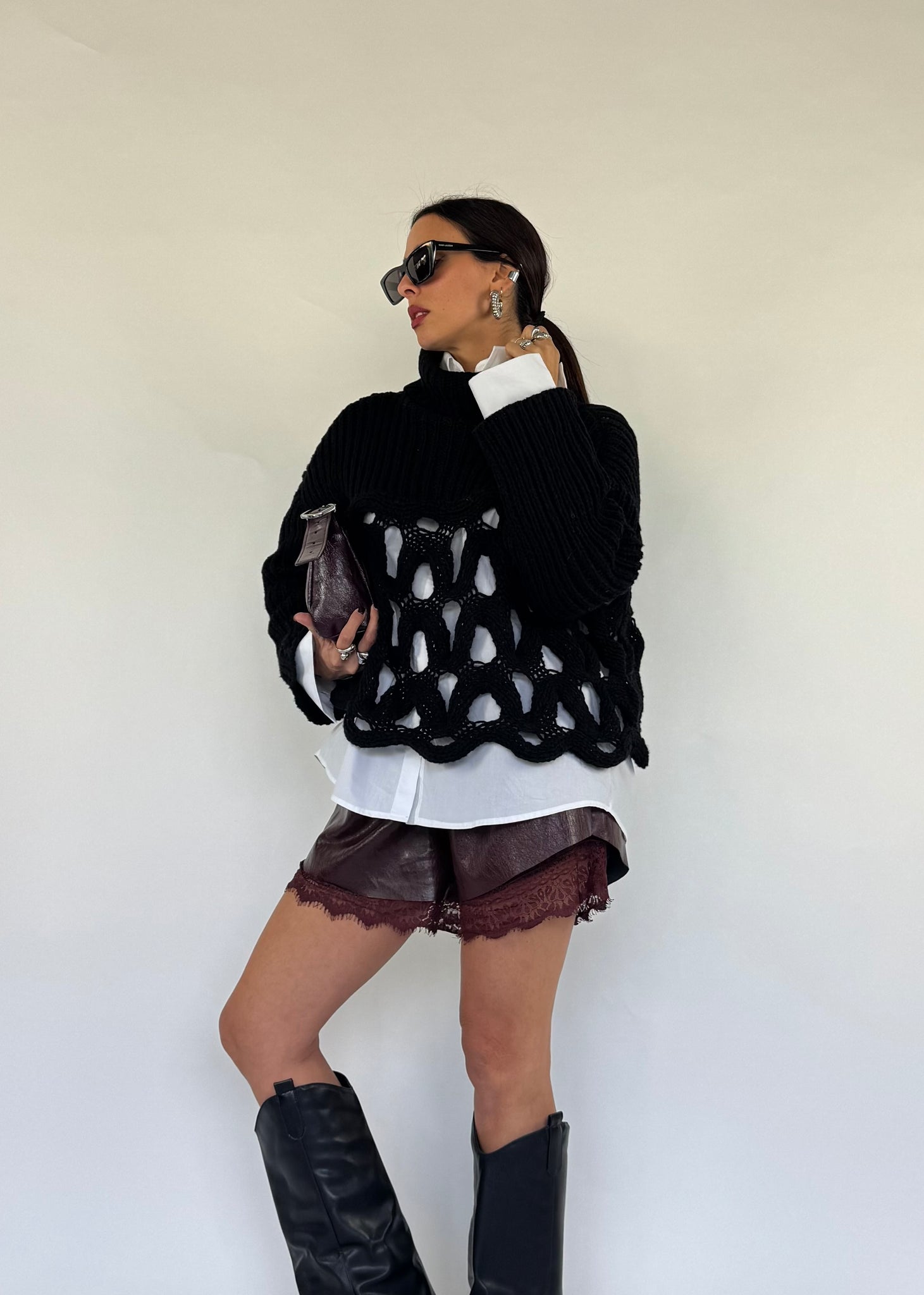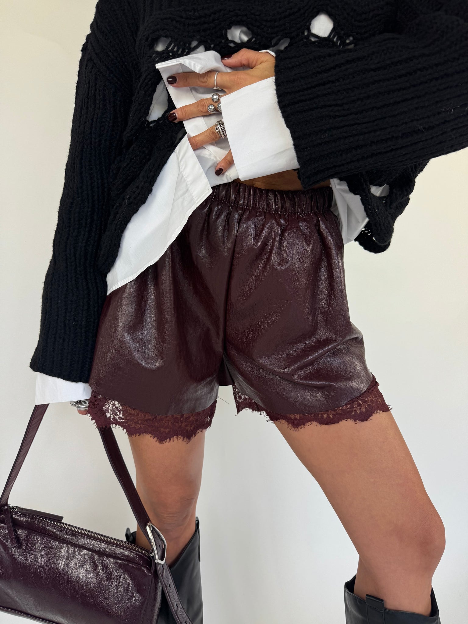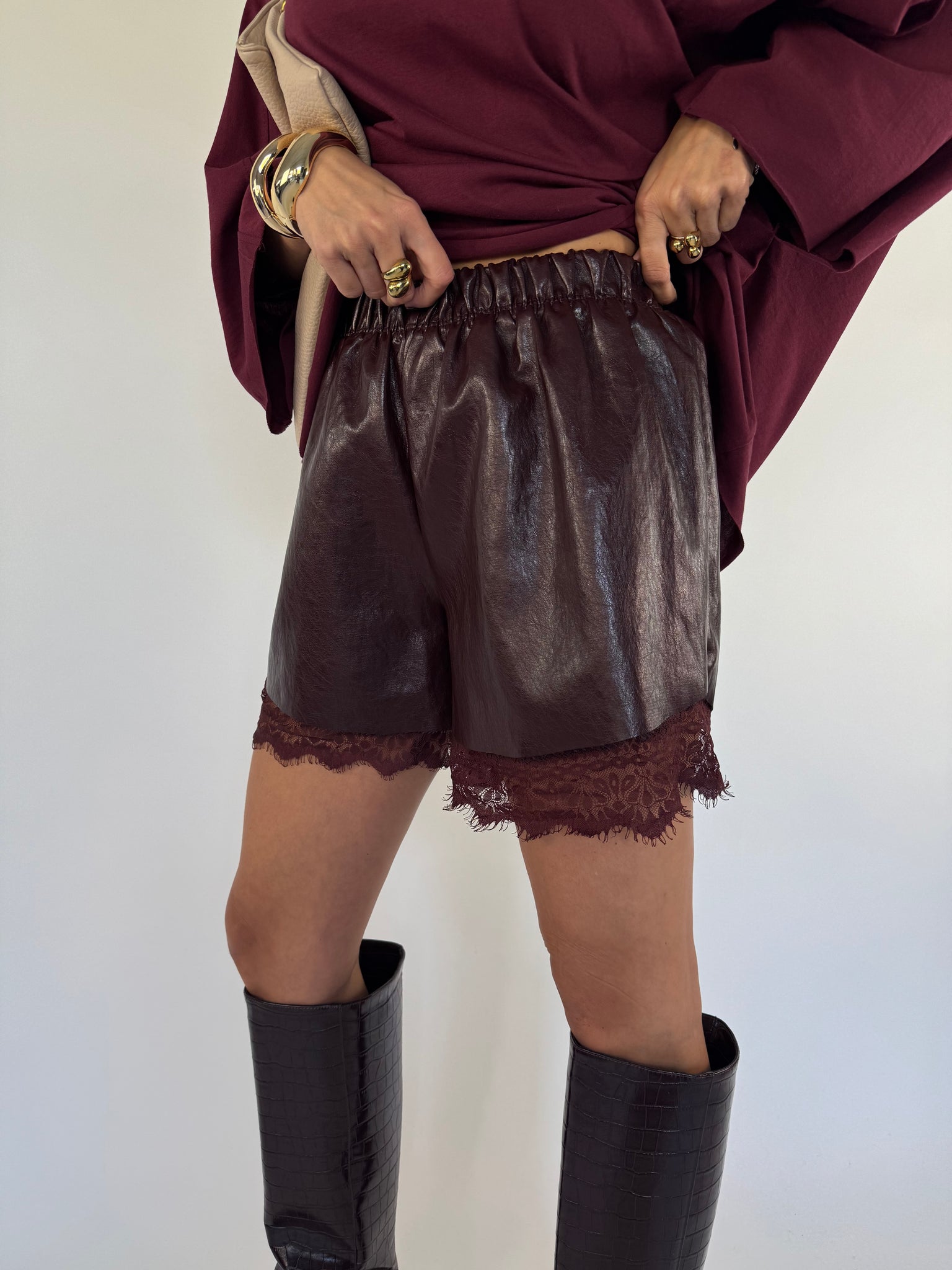 Pantaloncino doppio tessuto: ecopelle e orlo in pizzo. Taglia unica con elastico in vita. veste da 38 a 46