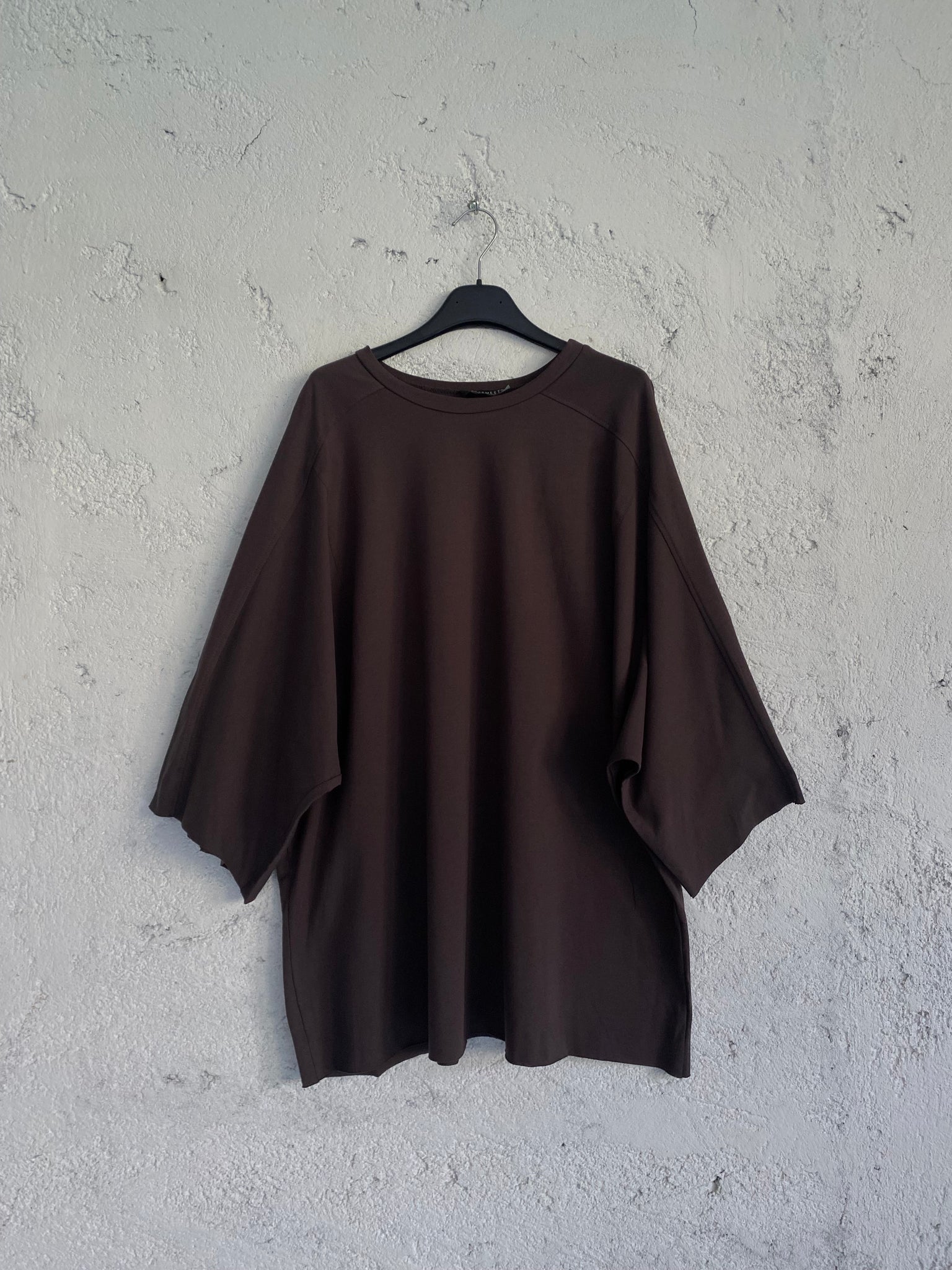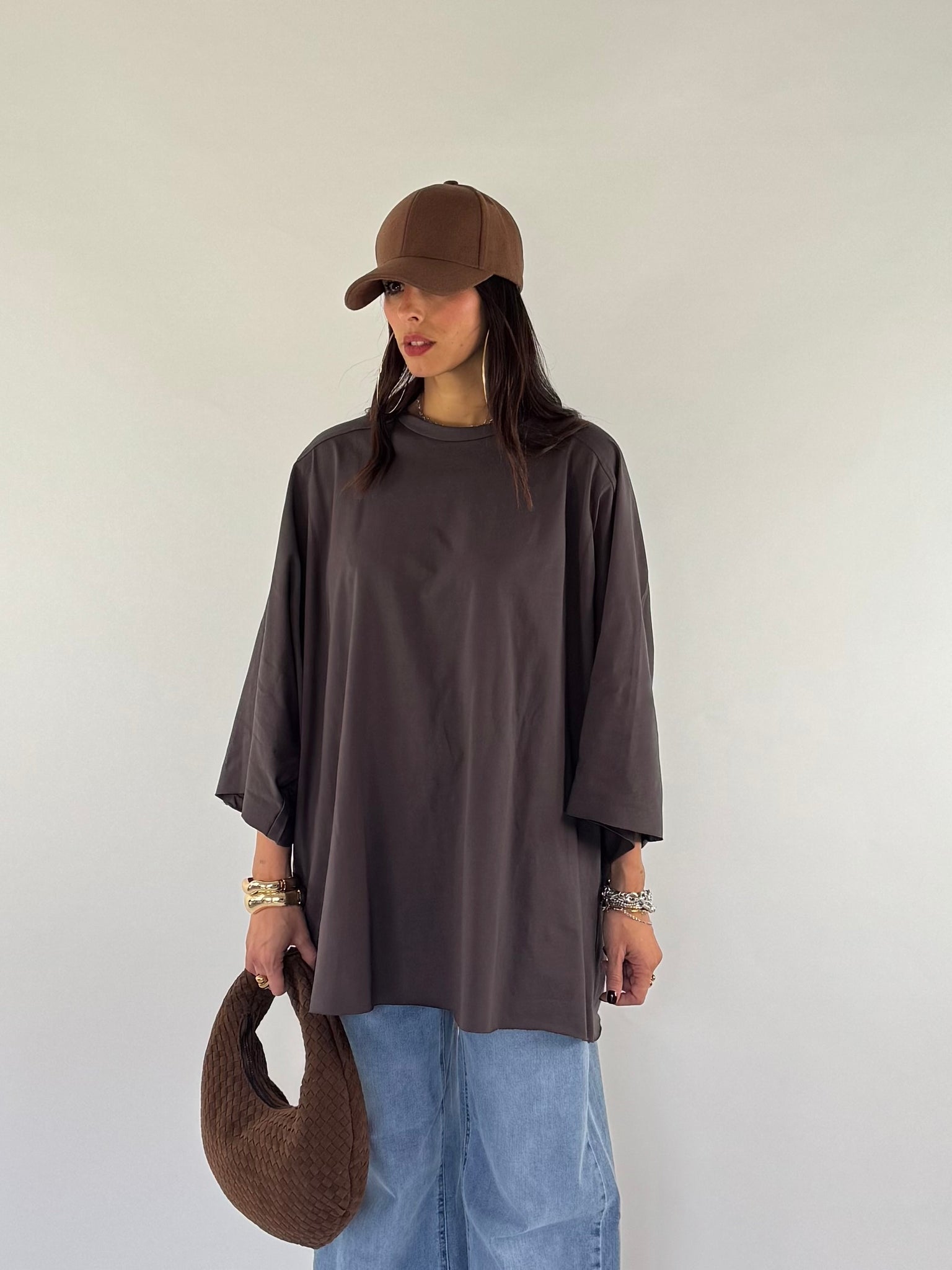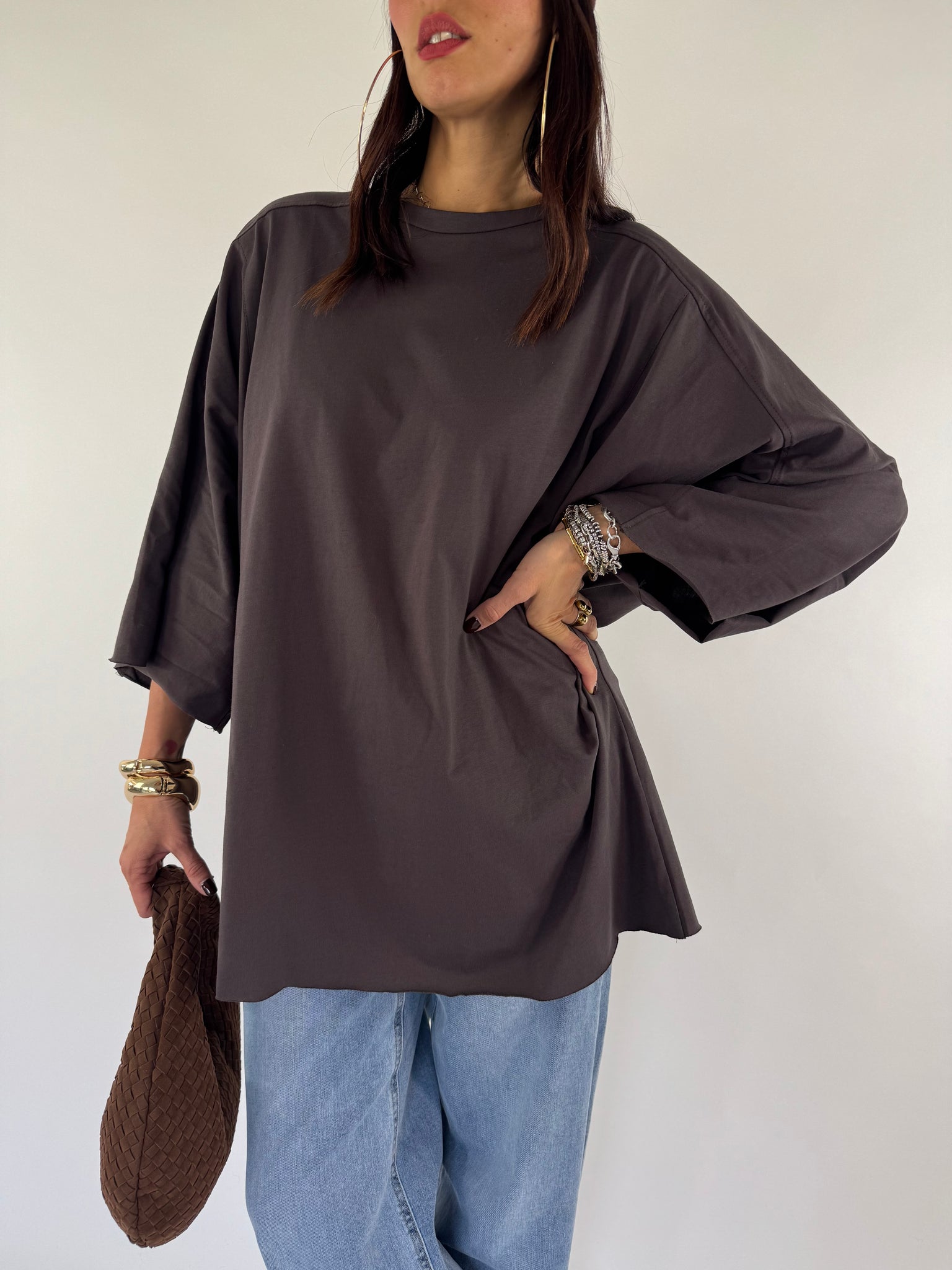 T-shirt girocollo modello over, manica lunghezza gomito, orli a taglio vivo. TU veste da xs a xxl