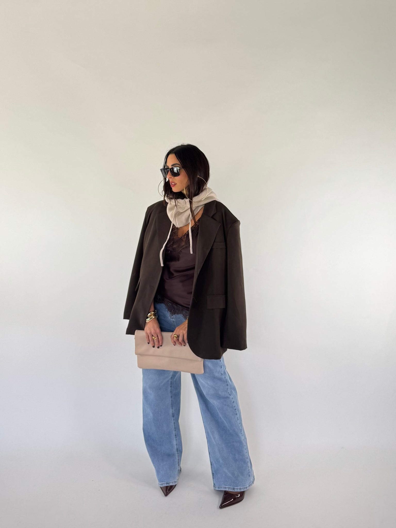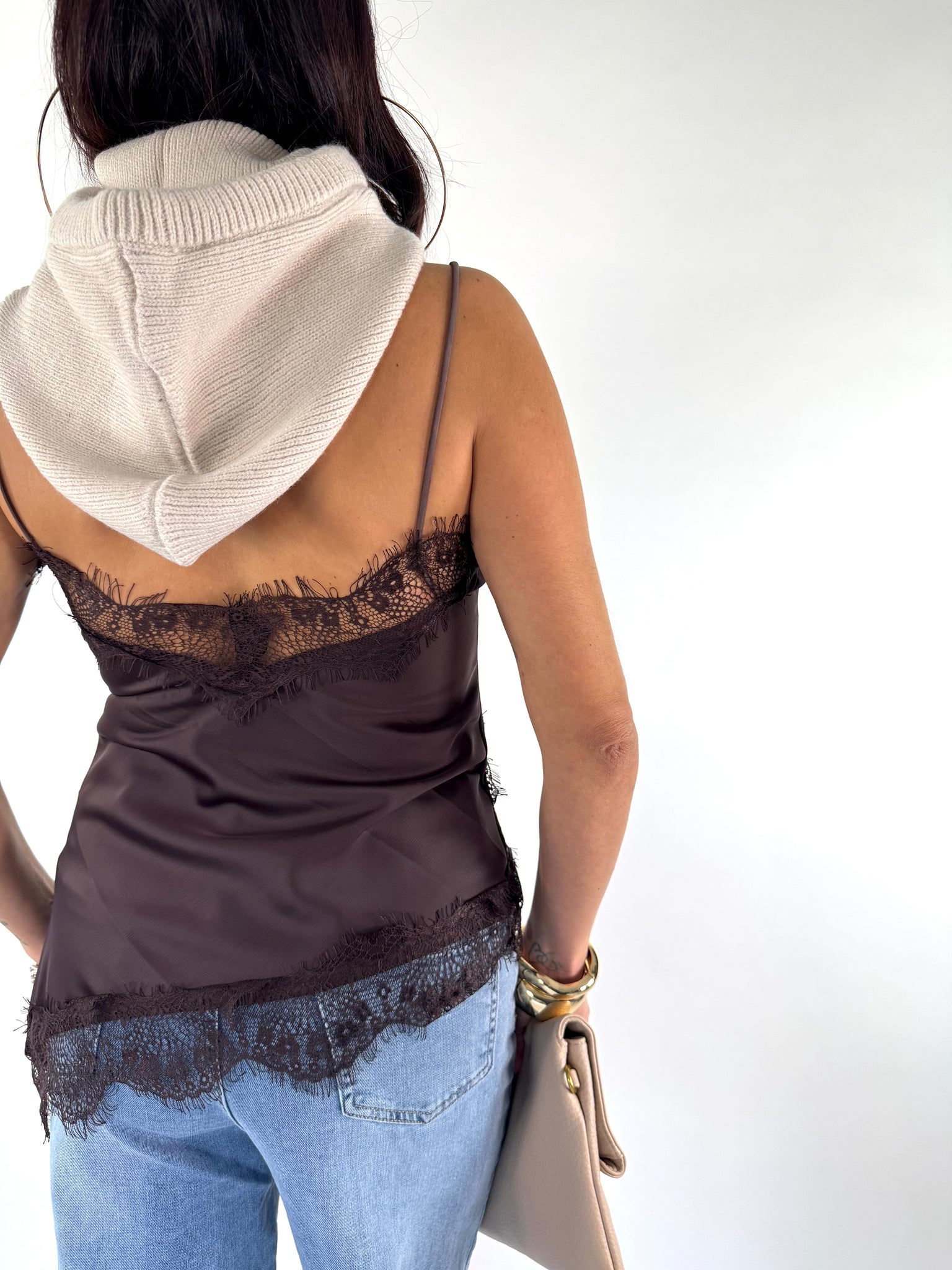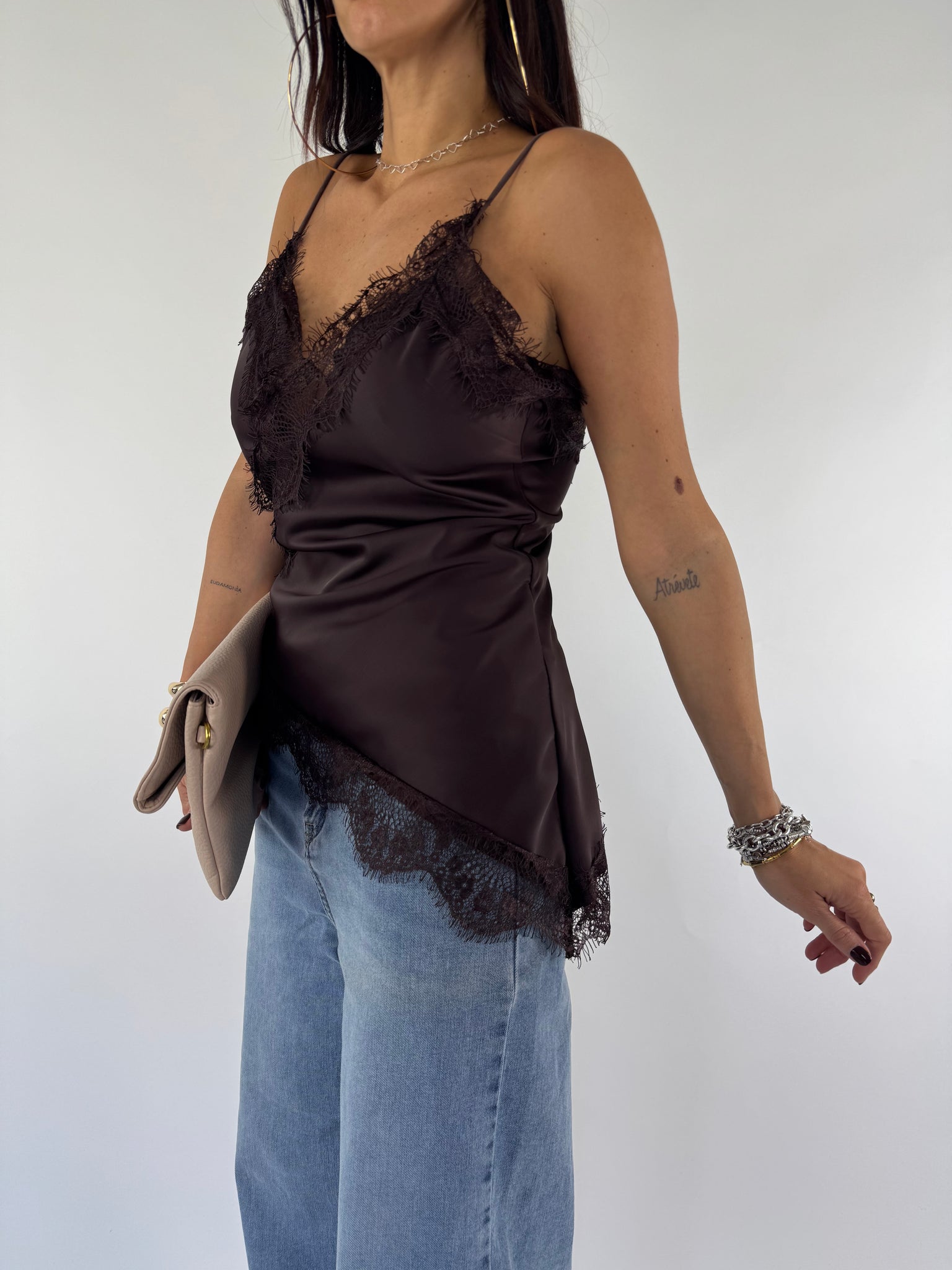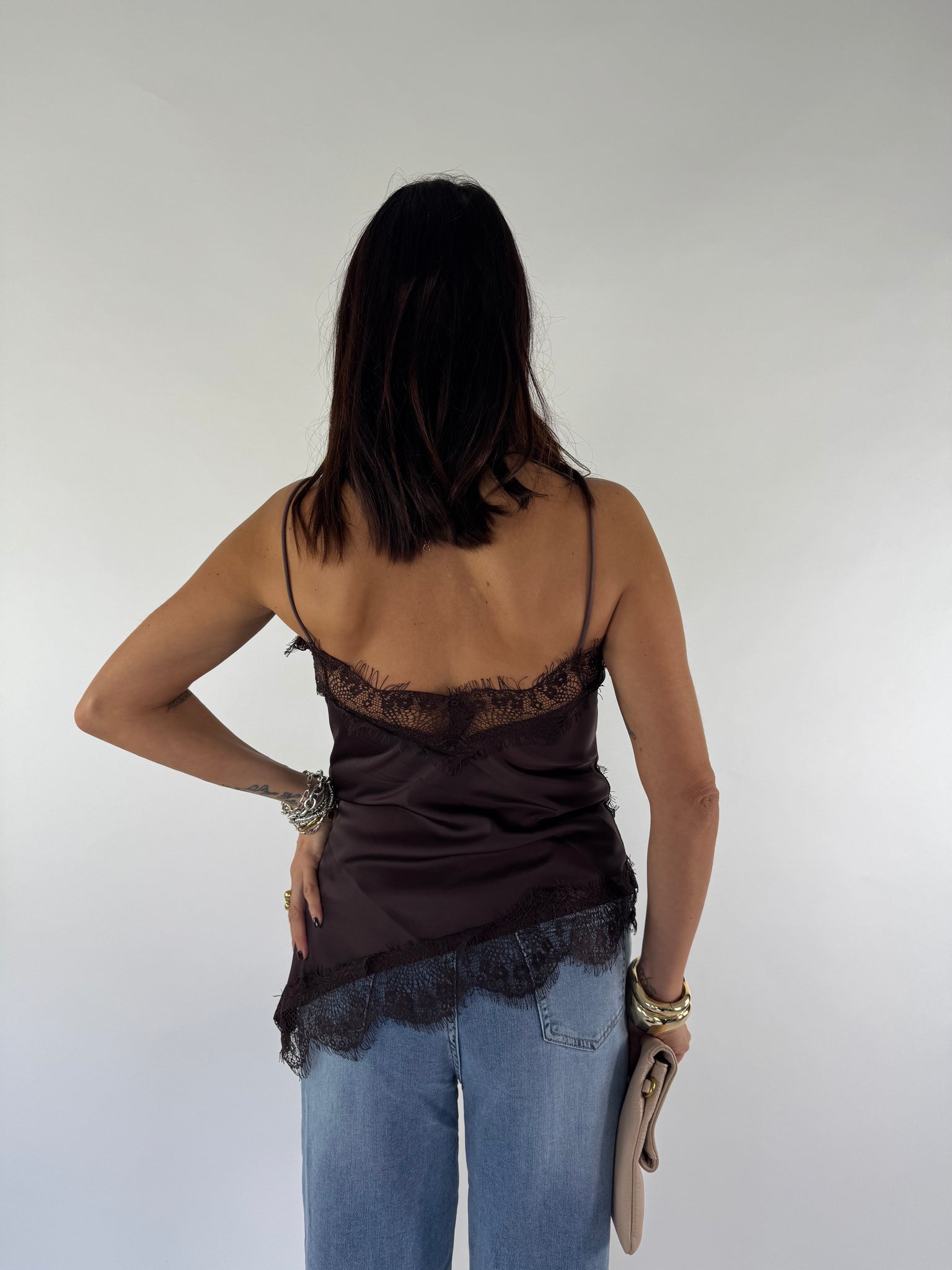 Canotta in satin con spalline sottili e scollo a V. Dettaglio applicazioni in pizzo. Taglia unica veste da 38 a 44