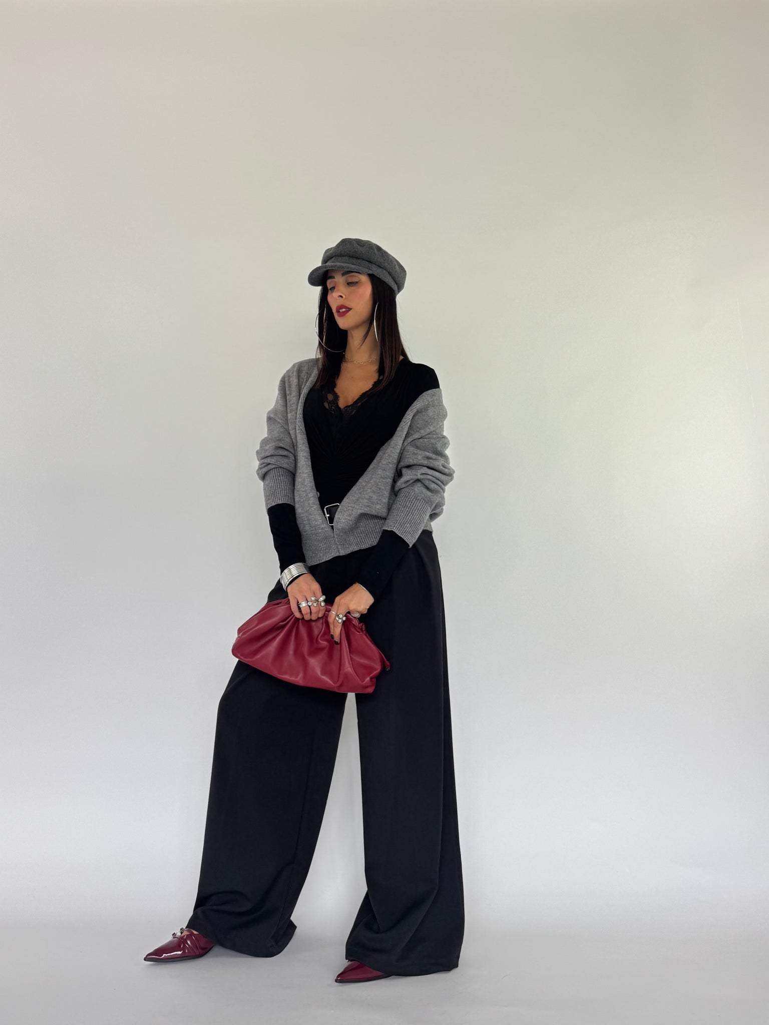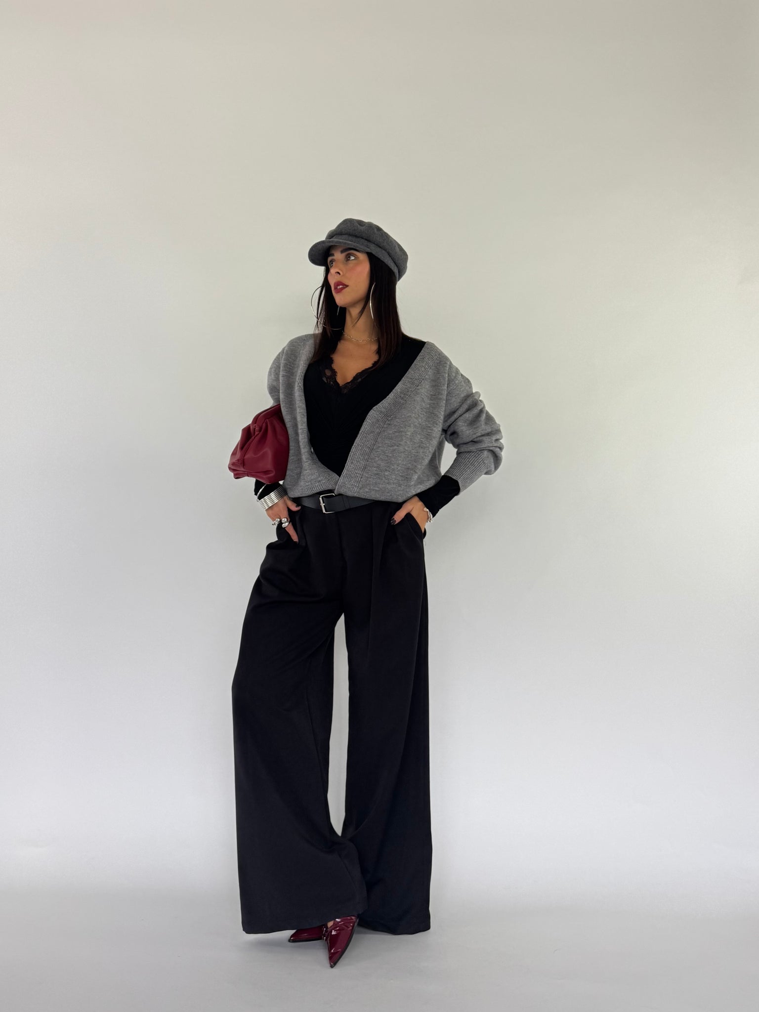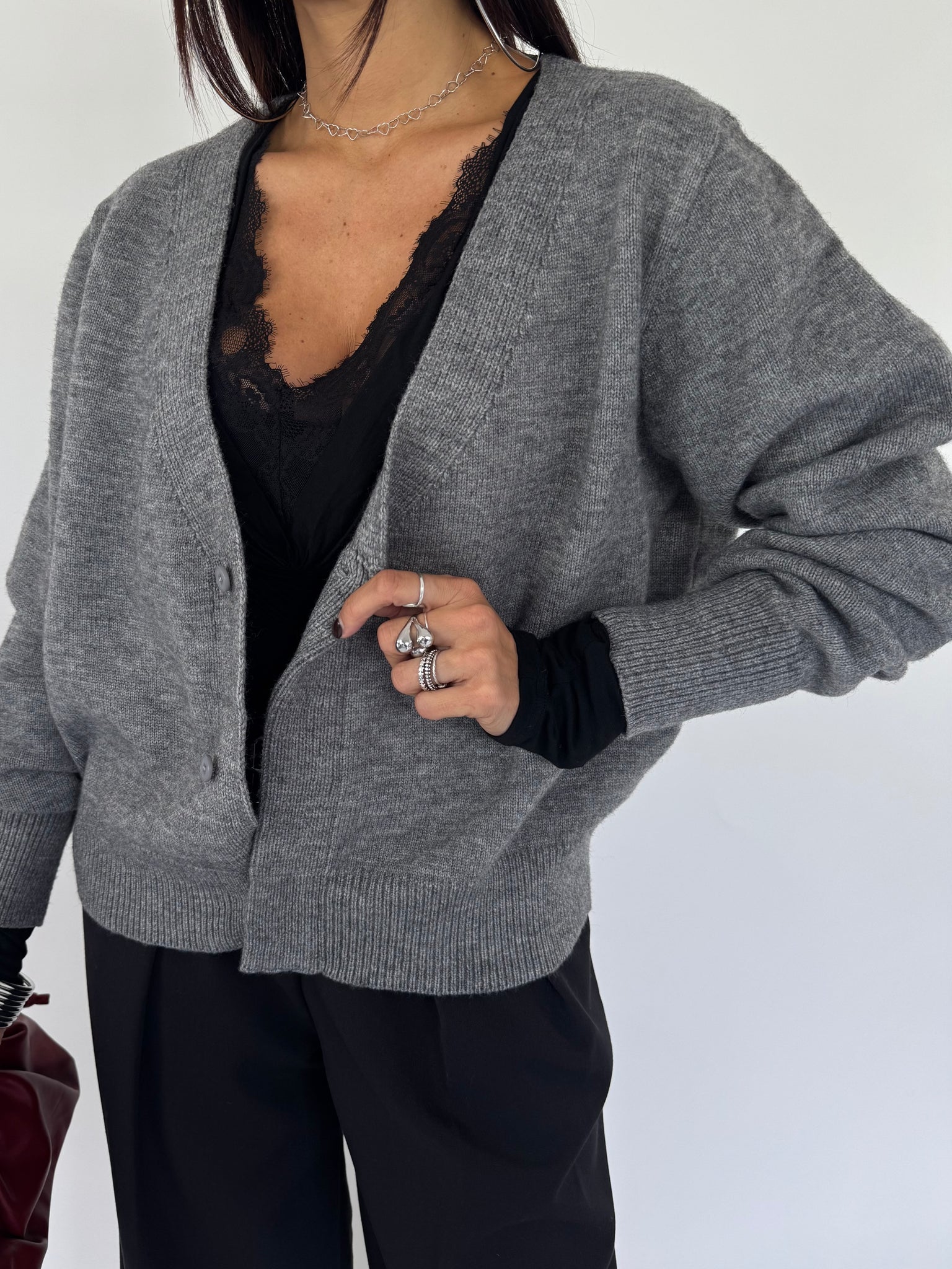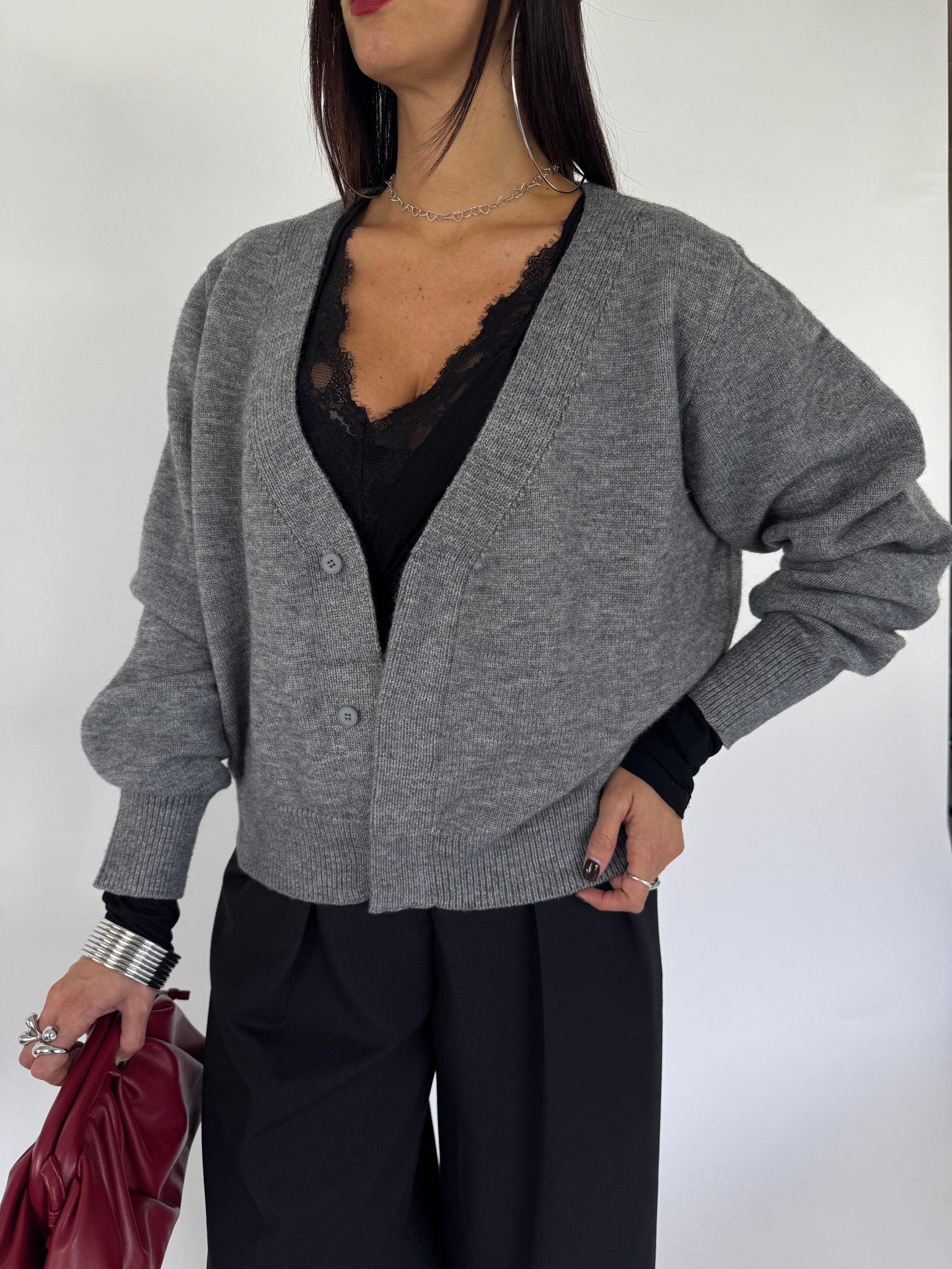 Cardigan scollo a V, dettaglio bottoni nascosti, polsi e orlo a costine. Taglia unica veste da 38 a 46